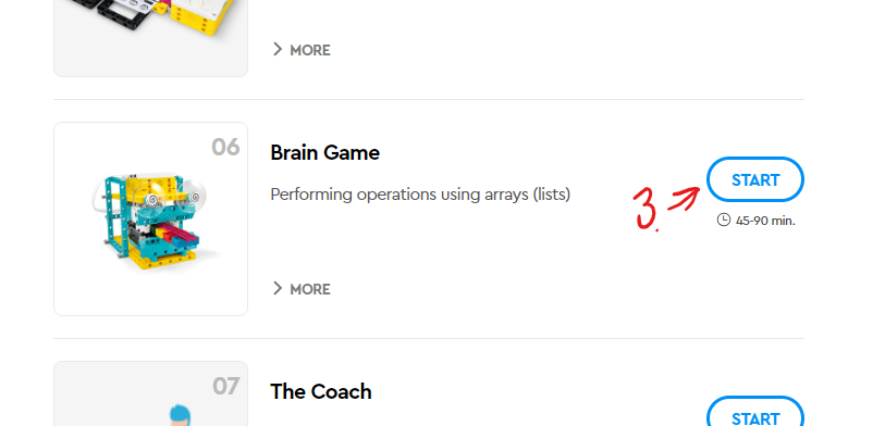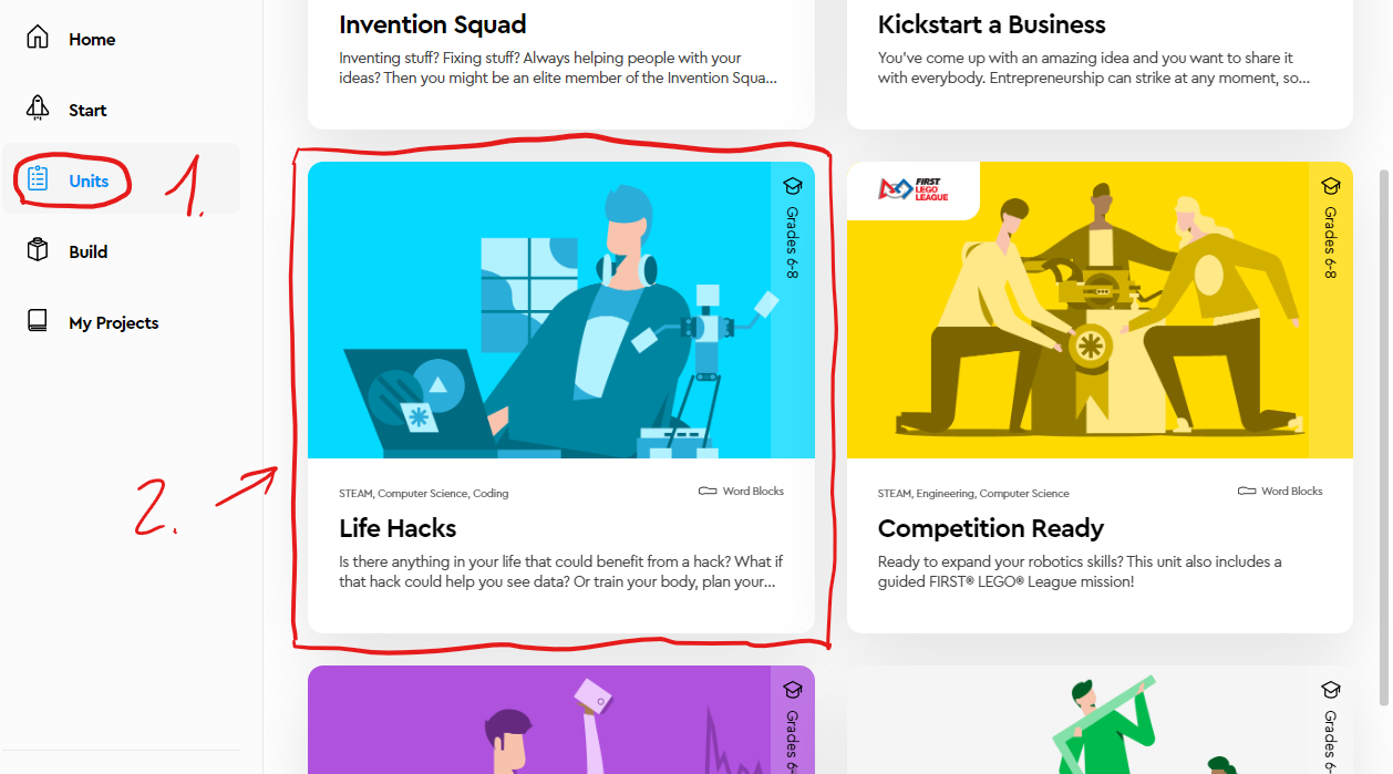 Dnes si zkusíme jednu z oficiálních lekcí z LEGO Spike. Po spuštění vybereme tlačítko Units, kde vybereme Life Hacks a zde Brain Game.